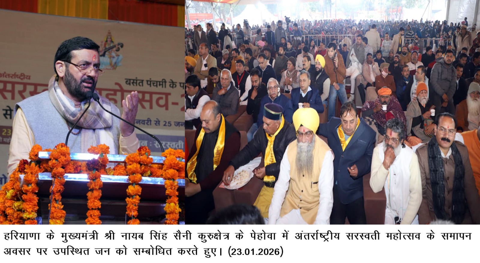 मुख्यमंत्री नायब सिंह सैनी शुक्रवार को पिहोवा सरस्वती तीर्थ पर हरियाणा सरस्वती धरोहर विकास बोर्ड की तरफ से बसंत पंचमी के पावन पर्व पर आयोजित सरस्वती महोत्सव 2026 के समापन समारोह में बोल रहे थे। इससे पहले मुख्यमंत्री नायब सिंह सैनी ने हरियाणा सरस्वती धरोहर विकास बोर्ड की सरस्वती नदी के पुन उद्धार के लिए 63 करोड़ 86 लाख रुपए की लागत से 26 परियोजनाओं का उदघाटन एवं शिलान्यास किया। इनमें से 27 करोड़ 59 लाख रुपए की लागत से 16 परियोजनाओं का उद्घाटन और 36 करोड़ 27 लाख रुपए की लागत से 10 परियोजनाओं का शिलान्यास शामिल है। मुख्यमंत्री ने सरस्वती तीर्थ को विकसित करने के लिए एक मास्टर प्लान का भी शिलान्यास किया है।